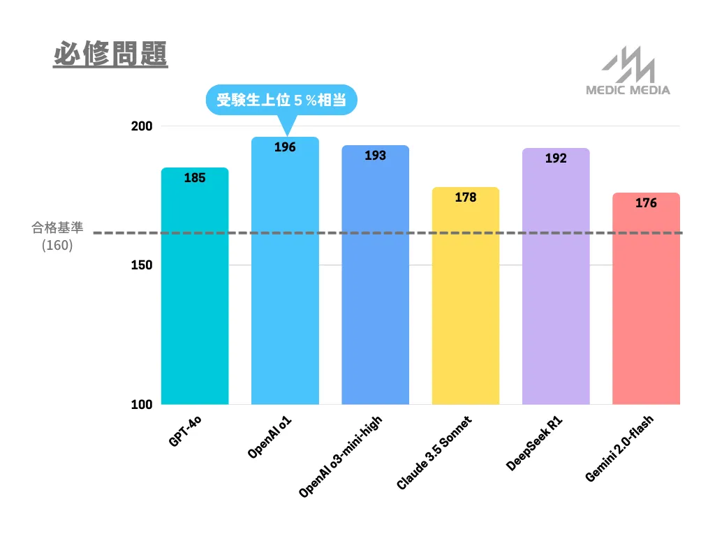 今回の検証では、6つの異なるAIモデルが医師国家試験の問題を解き、All of themで合格ラインを超えました。特に印象的なのは、OpenAIのo1モデルが必修問題で196点を記録し、受験生の上位5%に相当する成績を収めたことです。