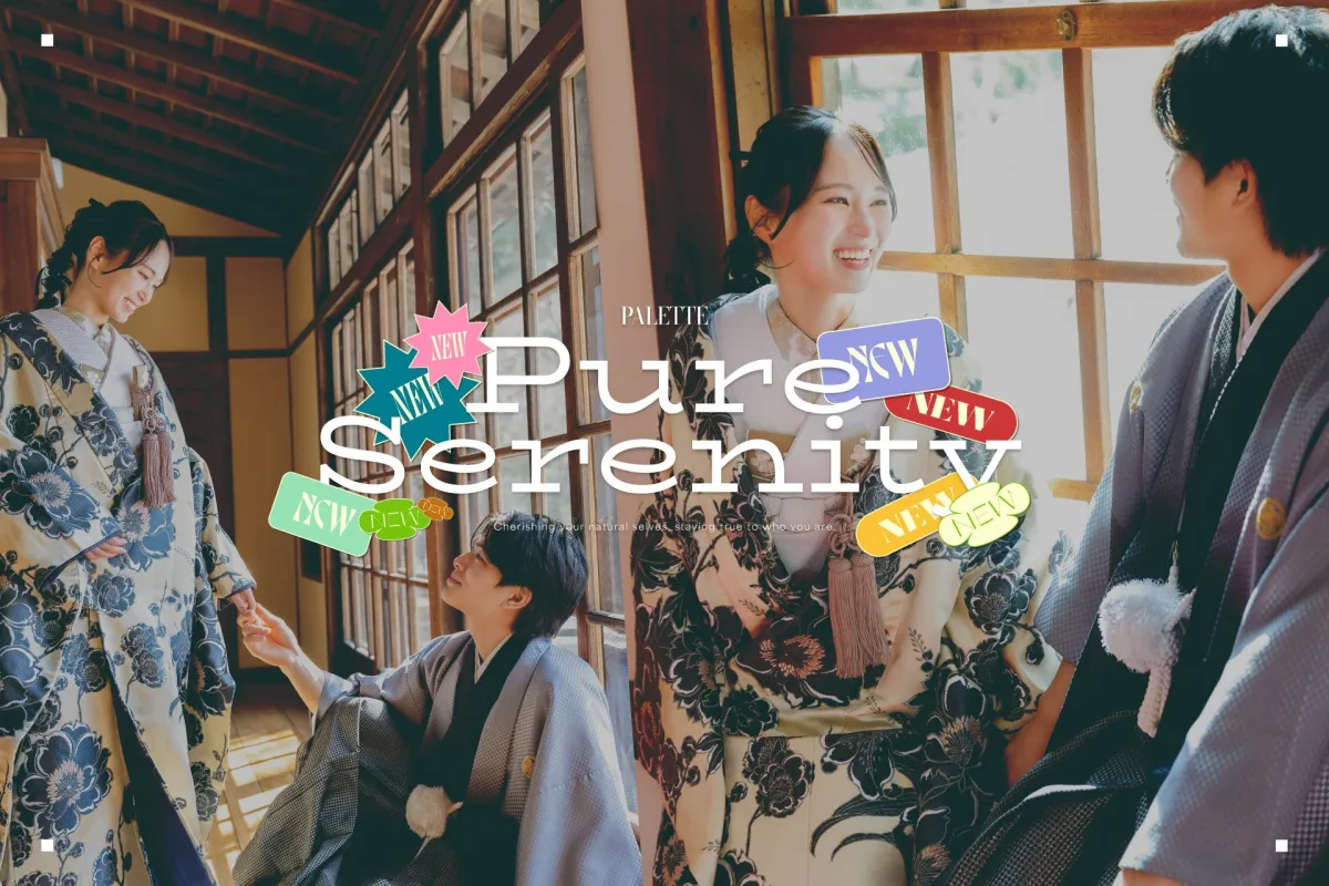 新たなビジュアルでは、和装の持つ凛とした美しさと、旧永山邸の窓から差し込む自然光が織りなす柔らかさを強調。特に、さりげない笑顔や視線が交差する瞬間を切り取ることで、まるで日常の延長線上にいるかのような温かみを感じさせるカットが特徴となっています。「Pure Serenity」をテーマにすることで、夫婦の特別な瞬間がより心に残るものとなるでしょう。