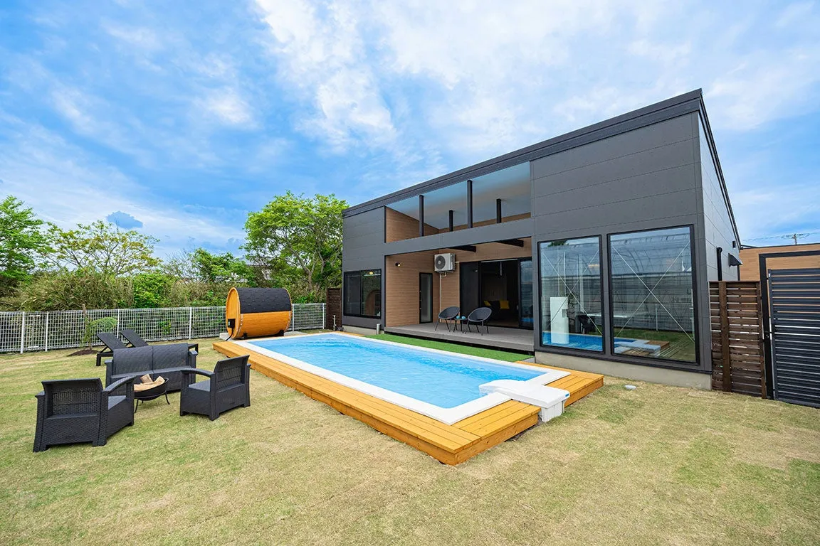 「プライベートヴィラAMIRU千葉一宮」は、全棟貸切型のドッグフレンドリー・ヴィラです。こちらのヴィラには、愛犬がのびのびと遊べるプライベートドッグランやプール、バレルサウナの設備が整っており、周囲を気にせず、愛犬と共にストレスフリーで過ごすことができます。