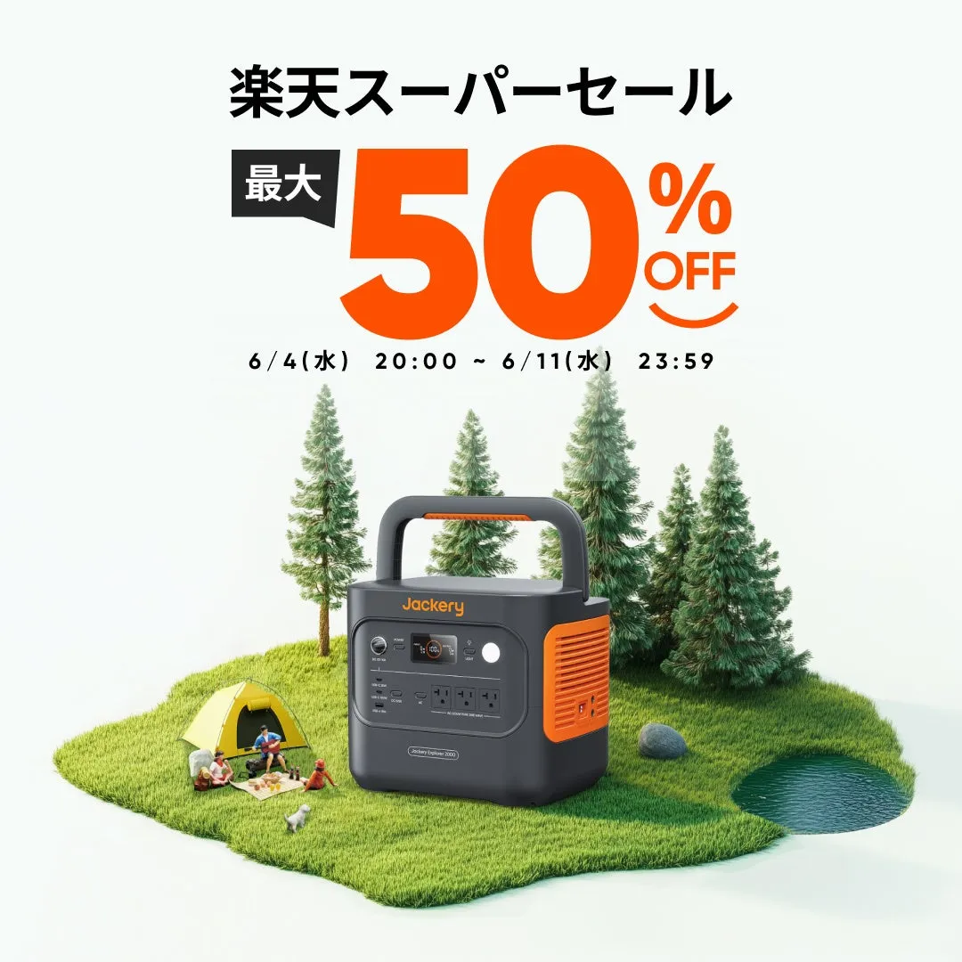 このセールは、2024年6月4日(水)20:00から6月11日(火)23:59までの期間中、Jackery楽天市場店にて行われます。ポータブル電源やソーラーパネルがなんと最大50%OFFで購入できるチャンスです!セール期間中には、人気モデルに45%OFFのクーポンに加え、さらに5%OFFクーポンの併用も可能です。この機会にぜひ、お得にJackery製品を手に入れて、っとも快適で安心できる夏のレジャーを楽しみましょう。