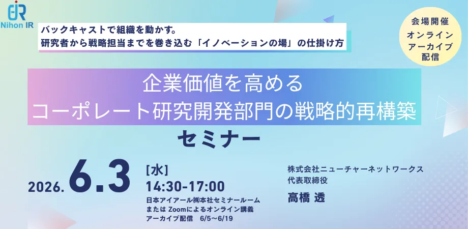 このセミナーでは、コーポレート研究開発部門の新たな位置づけやその役割について考察し、企業の中長期成長期待をデザインするための戦略を探ります。具体的には、将来のドメインやポートフォリオ戦略の構築方法、経営戦略や事業戦略との連携、さらに投資家向け情報としてのIRに関する活用法について学ぶことができます。
