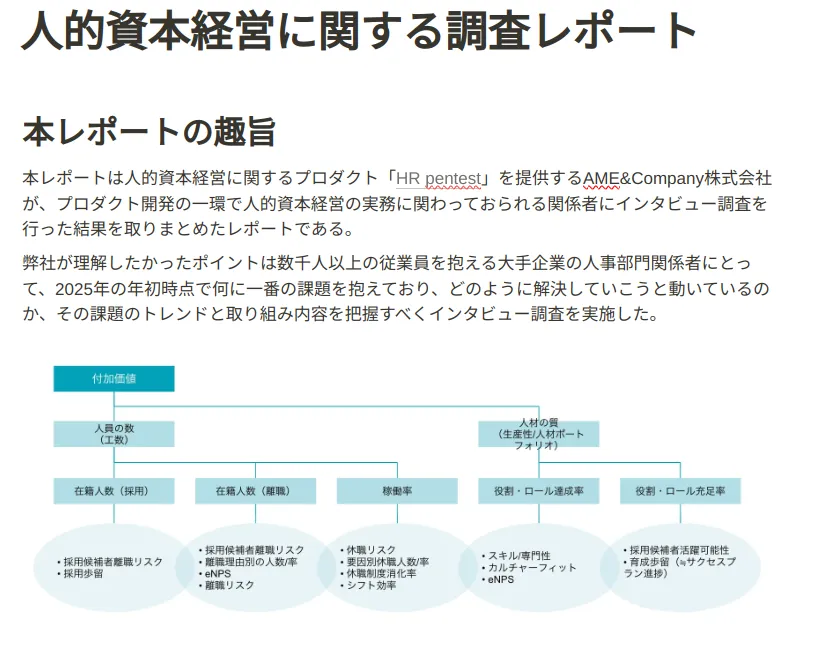 最近、AME&Company株式会社は「HR Pentest」と名付けられたプロダクトの一環として、人的資本経営に関する重要な調査結果を発表しました。このレポートは、数千人の従業員を持つ大手企業の人事部門関係者にインタビューした結果をもとにしています。