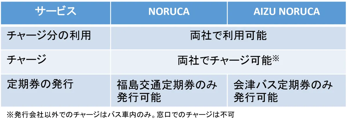 - - 共通利用サービス: 福島交通の路線バスや電車に「AIZU NORUCA」で、会津バスには「NORUCA」で乗車できるようになります。