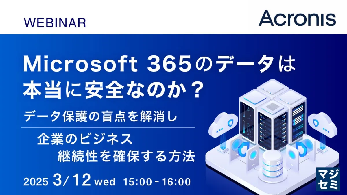 そこで、このウェビナーでは、Acronis Cyber Protectを利用した成功事例と共にMicrosoft 365環境におけるデータ保護の盲点を明らかにし、企業がどのようにビジネスの継続性を確保できるかを詳しく説明します。この中で、データ喪失やサイバー攻撃を受けた際の迅速かつ効果的な復旧方法や、データ安全性を保つための最適なアプローチも紹介される予定です。