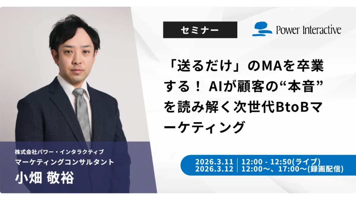 2026年3月11日、株式会社パワー・インタラクティブが主催する無料ウェビナー『「送るだけ」のMAを卒業する! AIが顧客の“本音”を読み解く次世代BtoBマーケティング』が開催される。最先端のマーケティング戦略やAI技術を利用して、企業が顧客のニーズを的確に把握する手法について学ぶことができる。