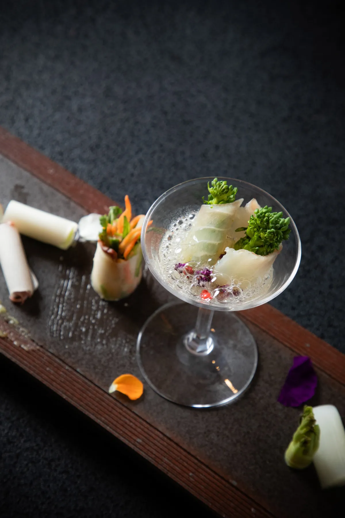このコースの初めに提供されるのは、春を感じる一皿です。新じゃがの擦り流しは豆腐仕立てで、上品な味わいが楽しめます。さらに、北斗産の軟白ネギとホタルイカの酢味噌添えや、大根を使った生春巻き風の料理も並び、目でも楽しめるように工夫されています。