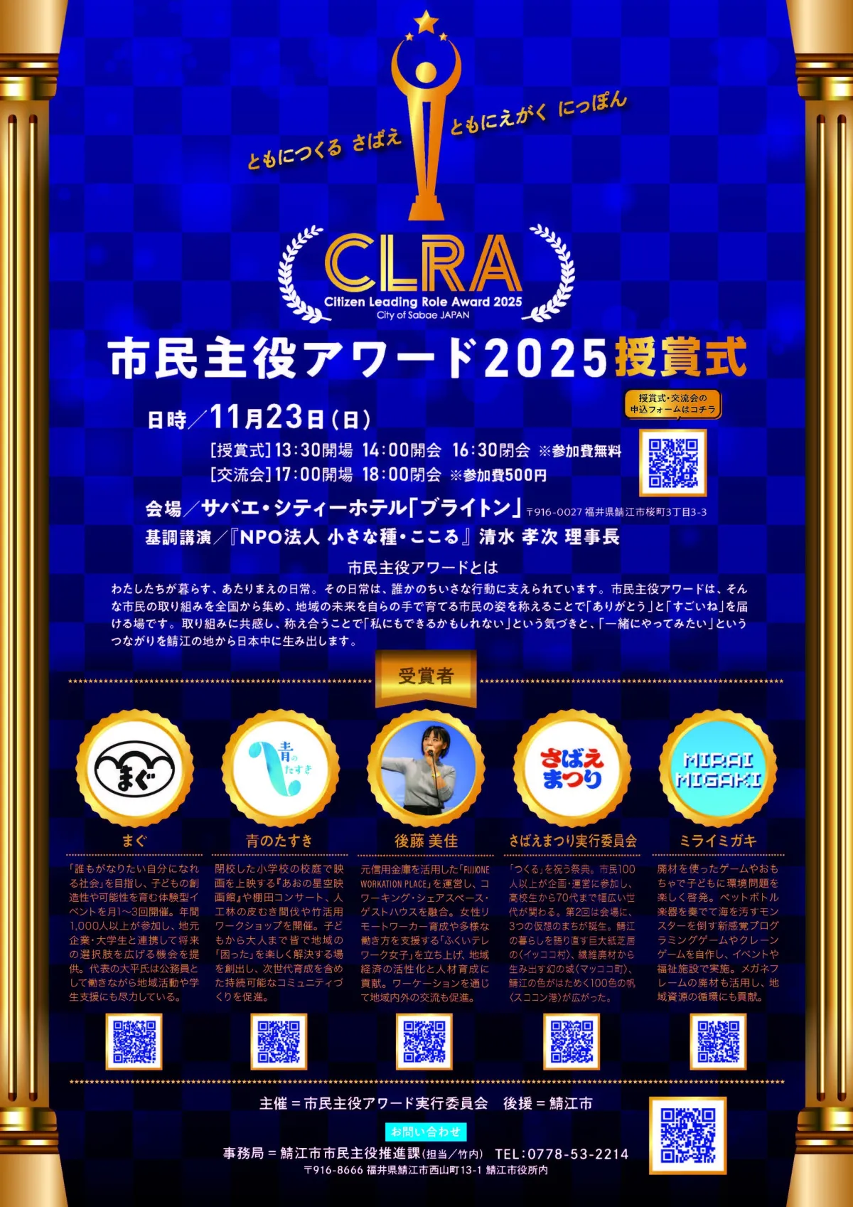 今年も「市民主役アワード2025」が11月23日(日・祝)に華やかに開催されます。このアワードは「市民主役のまちさばえ」の理念に基づき、市民が推薦した地域の優れた活動を称えるイベントです。地域の課題解決や魅力向上に貢献している個人や団体を表彰することで、地域のまちづくりに対する市民の参加意欲を高めていくことを目的としています。