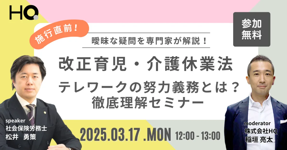 企業における働き方が大きく変わる中、特に注目されているのが改正育児・介護休業法です。この改正により、企業はテレワークの実施に関する努力義務が課されることになりました。本記事では、2025年3月17日に開催されるセミナー「改正育児・介護休業法改正の重要ポイント『テレワークの努力義務 徹底セミナー』」に焦点を当て、企業に求められる対応策や実務におけるポイントを解説します。