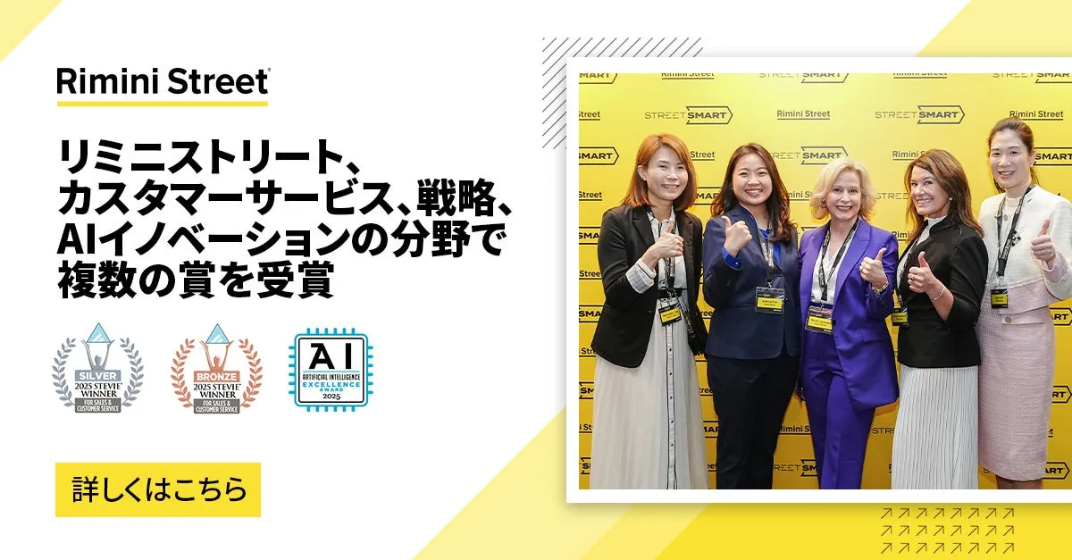 さらに、Business Intelligence Groupは、2025 AI Excellence AwardにおいてリミニストリートをBest AI-based Customer Service Solution of the Yearとして認めました。この賞は、AIを活用した革新を推進する企業を評価するもので、リミニストリートの特許取得済みAI強化型エンタープライズソフトウェアサポートがその一例です。この技術は、顧客エンジニアとリミニストリートの専門家を迅速に結びつけることで、問題解決を23%早めることに成功しました。