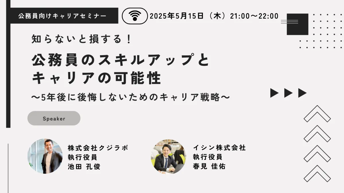 公務員が直面する変革の時代、私たちが今取り組むべきことは何でしょうか。5月15日に、イシン株式会社と株式会社クジラボが共催するセミナー「知らないと損する! 公務員のスキルアップとキャリアの可能性 ~5年後に後悔しないためのキャリア戦略~」が開催されます。このセミナーは、若手公務員を対象に、キャリア戦略について考える場となっています。