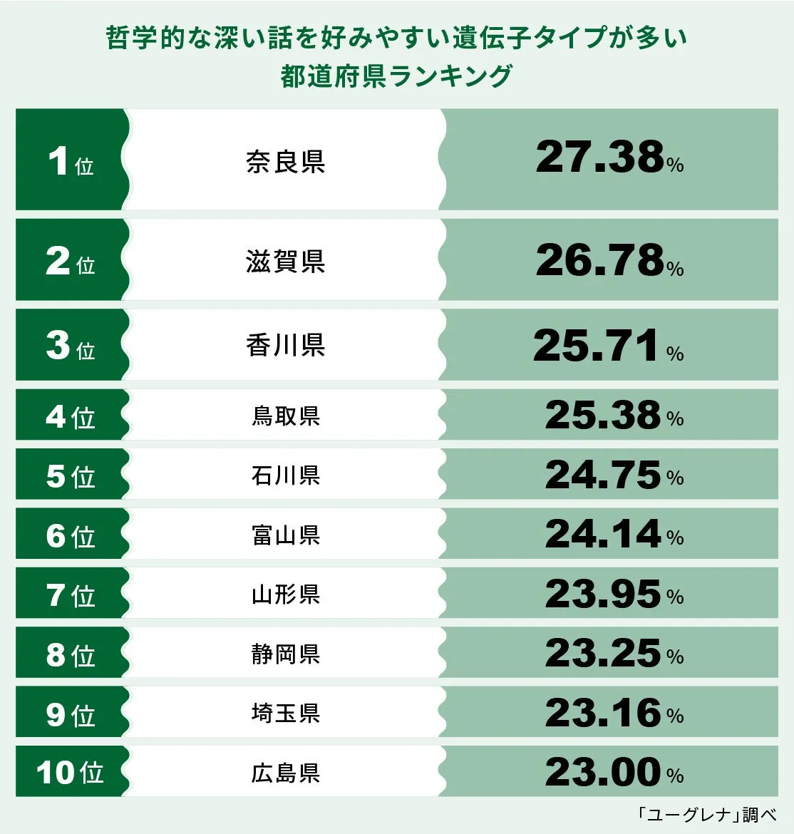 発表によると、「哲学的な深い話を好む遺伝子タイプが多い都道府県ランキング」は以下の通りです。