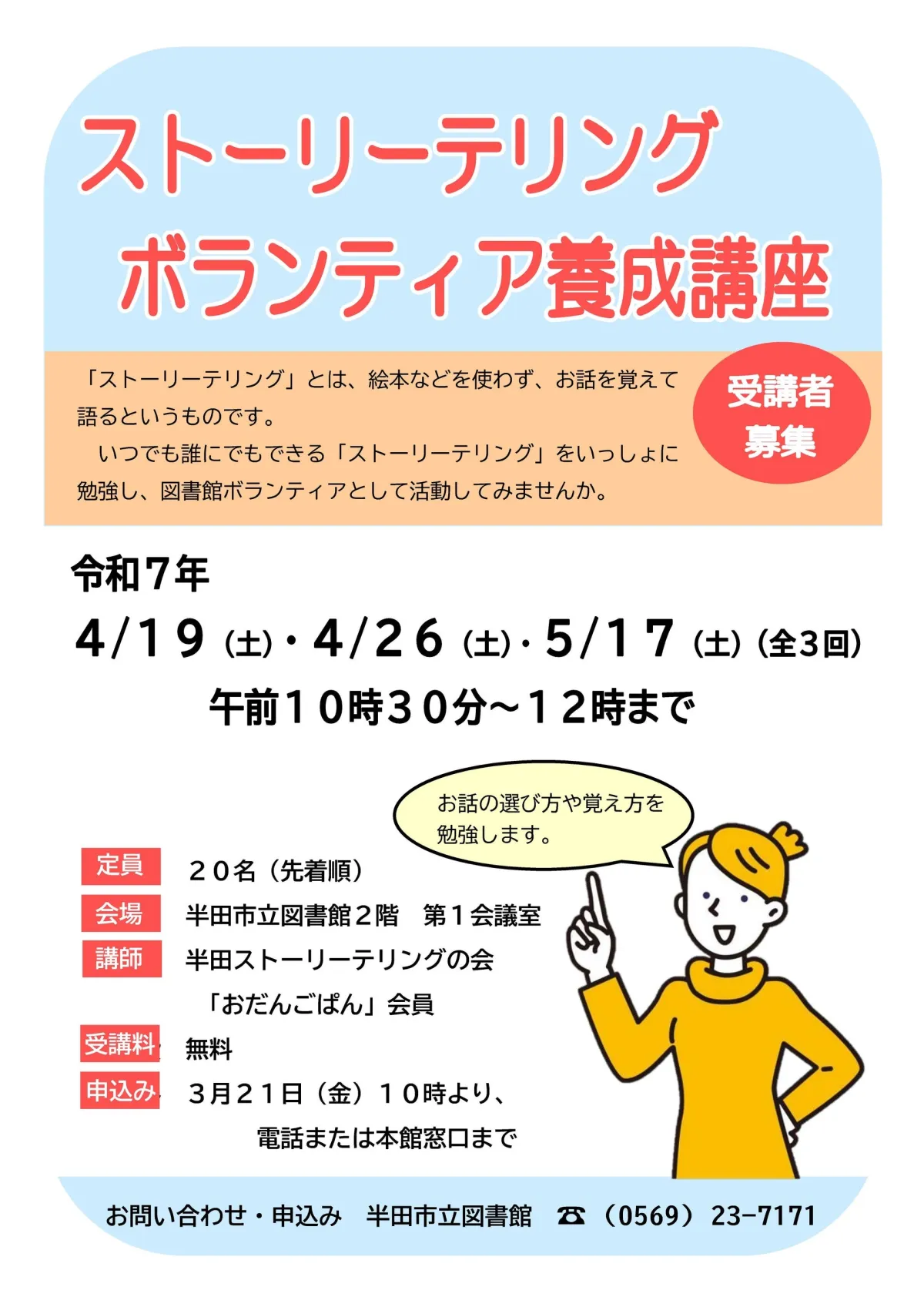 - - 対象: ストーリーテリングに興味があり、ボランティアとして活動を希望する方(定員20名、受講料は無料)