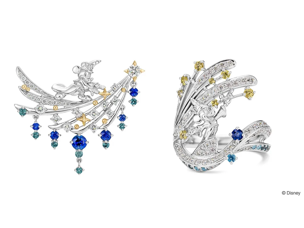今回発表された商品は、数量限定の新作ブローチとリングの2点。どちらも『ファンタジア』の象徴的なキャラクター、ミッキーマウスが夢の中で魔法使いとして登場するシーンを見事に再現しています。これらのジュエリーは、きらめく夜空を舞台にしたデザインで、宝石が繊細にあしらわれています。