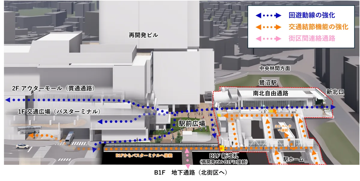 本再開発事業では、駅から新たに商業施設や公共施設へのスムーズなアクセスが可能になる設計が施されています。具体的には、地下1階に直結する改札口が新設され、交通広場と駅をつなぐ流動ラインが整備されます。これにより、鉄道とバス、タクシーへの乗り換えがよりスムーズに。