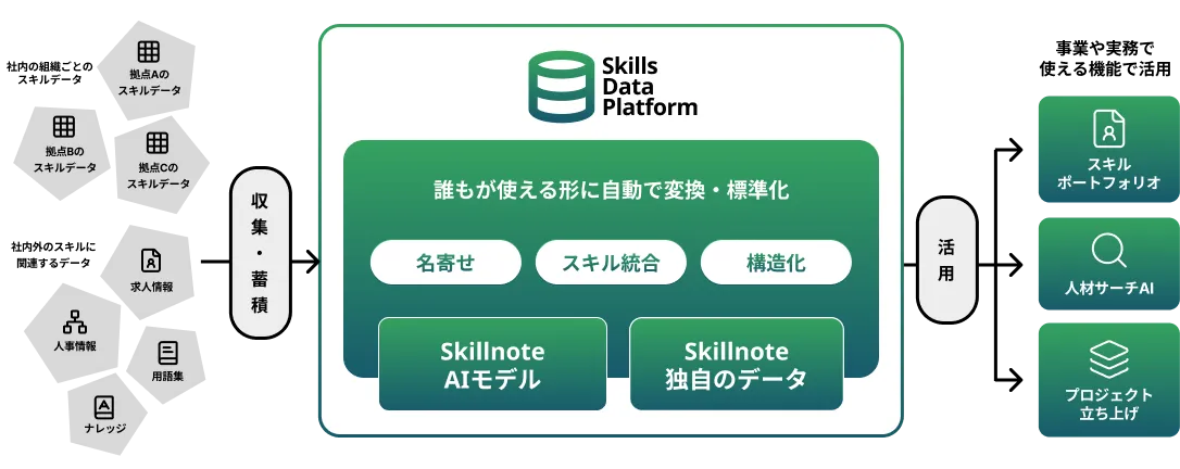 新たに開発される『スキルデータプラットフォーム』は、従業員の技術、技能や経験などの情報を、誰もが利用できるスキルデータとして変換するものです。このプラットフォームによって、製造業の各事業部や拠点で管理されているスキルデータと人事情報、さらには外部の求人情報までも統合的に管理することが可能になります。最終的には、業務横断的に特定スキルを持つ人材を検索することが可能となり、全社的なスキルの共通言語化を実現します。