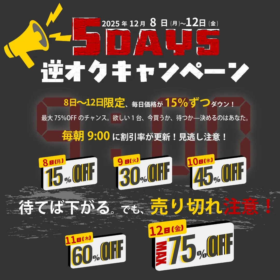 リユースPC事業を手がけるリングロー株式会社が、特別なセールイベント「5DAYS逆オクキャンペーン」を実施します。2025年12月8日(月)から12日(金)の5日間、ECサイト「Shii:Re」上で行われるこのキャンペーンは、毎日異なる割引率で、ユーザーに「今買うべきか、待つべきか?」と楽しませる仕掛けが施されています。