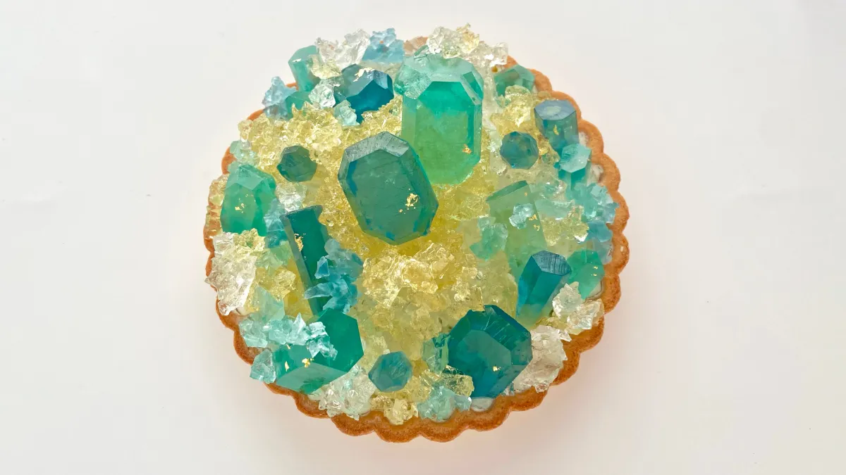 「誕生石のタルト」は、毎月の誕生石をスイーツで具現化するというコンセプトの元に作られています。今回の「エメラルド」は、希望と誠実の象徴とされる美しい緑色の石。このタルトは、職人の手による琥珀糖“こうぶつヲカシ”を使用し、瑞々しい輝きを表現しています。新緑の季節にぴったりの爽やかな彩りは、ラ・フランスとカボス味の琥珀糖がふんだんに散りばめられ、まさに宝石のような存在感を放っています。