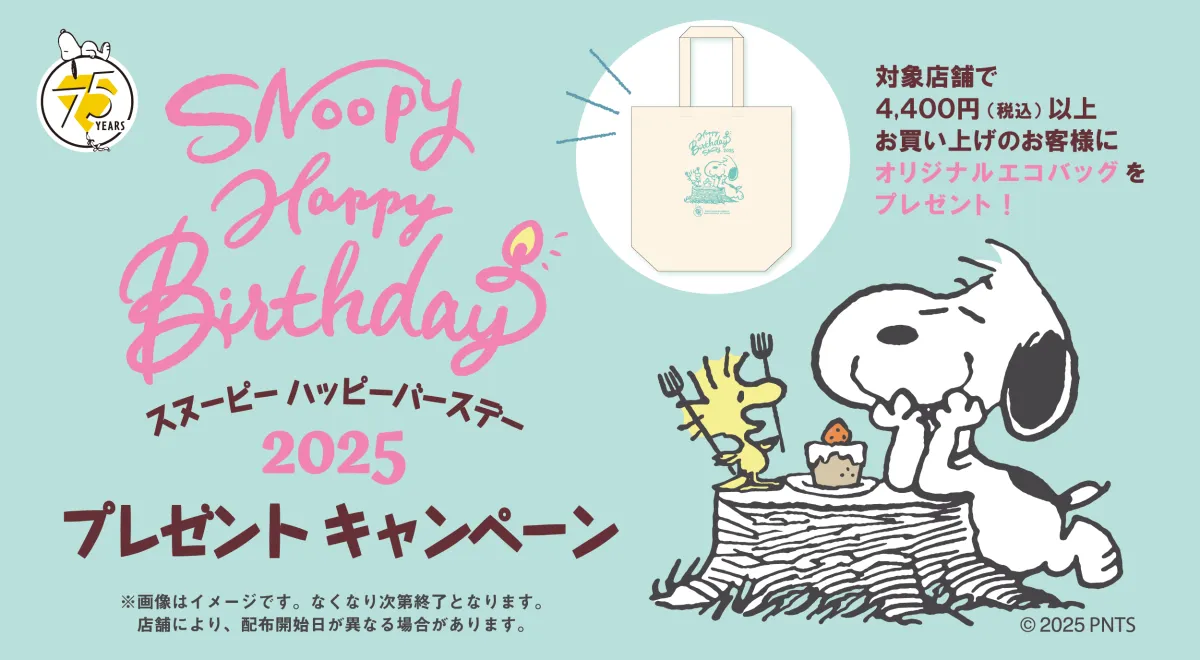 人気キャラクター「スヌーピー」の誕生日を祝い、2025年8月9日(土)から「スヌーピーのハッピーバースデープレゼントキャンペーン」が公式ショップでスタートします。このキャンペーンでは、税込4,400円以上お買い上げの方に、オリジナルデザインのエコバッグが1点プレゼントされます。