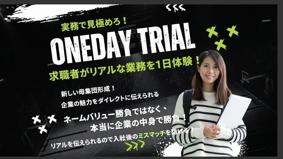 「ワンデイトライアル」の設立目的は、こうした採用課題を根本から解決し、企業と学生の双方にとって利点を提供することです。企業の魅力を知る機会が減り、入社後のミスマッチが起こる中、1日就業体験を通じてリアルな業務を体験することで、より正確な採用判断が可能になります。