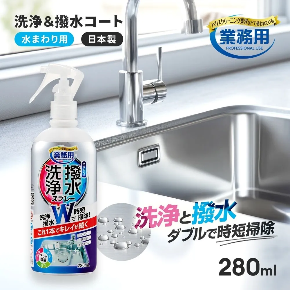 「洗浄と撥水コートスプレー」は、家庭で使用するために特別に設計されています。この製品は、1本で洗浄・撥水・防汚の3つの効果を提供します。水をはじくことで水滴が滑り落ちやすくなり、水アカを適切に防止します。具体的には、シンクや洗面台、浴室の鏡などに使用でき、業務用としての実績もあるため、その効果は確かなものと言えます。