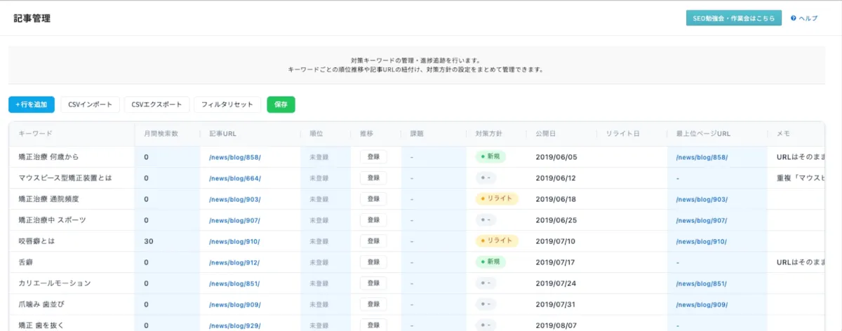 取得した順位データを基に、TACT SEO内で直ちに改善方針を検討できます。これにより、データ分析から施策立案までをシームレスに行うことができ、加えてソートやフィルタ機能を用いることで、さらに効率的に次のアクションに移行することが可能です。