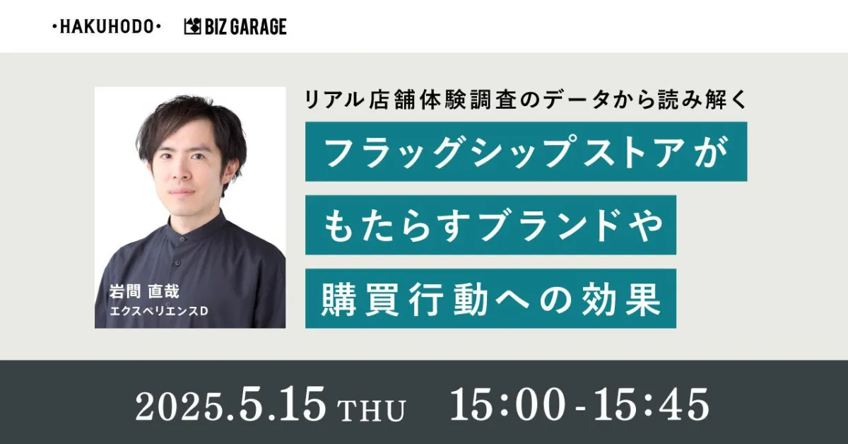 博報堂が運営するビジネスポータル「BIZ GARAGE」は、最新のマーケティング情報や事例、各種効果を解説するウェビナーを無料で開催しています。このたび、注目のテーマとして「リアル店舗体験調査のデータから読み解くフラッグシップストアがもたらすブランドや購買行動への効果」が取り上げられます。