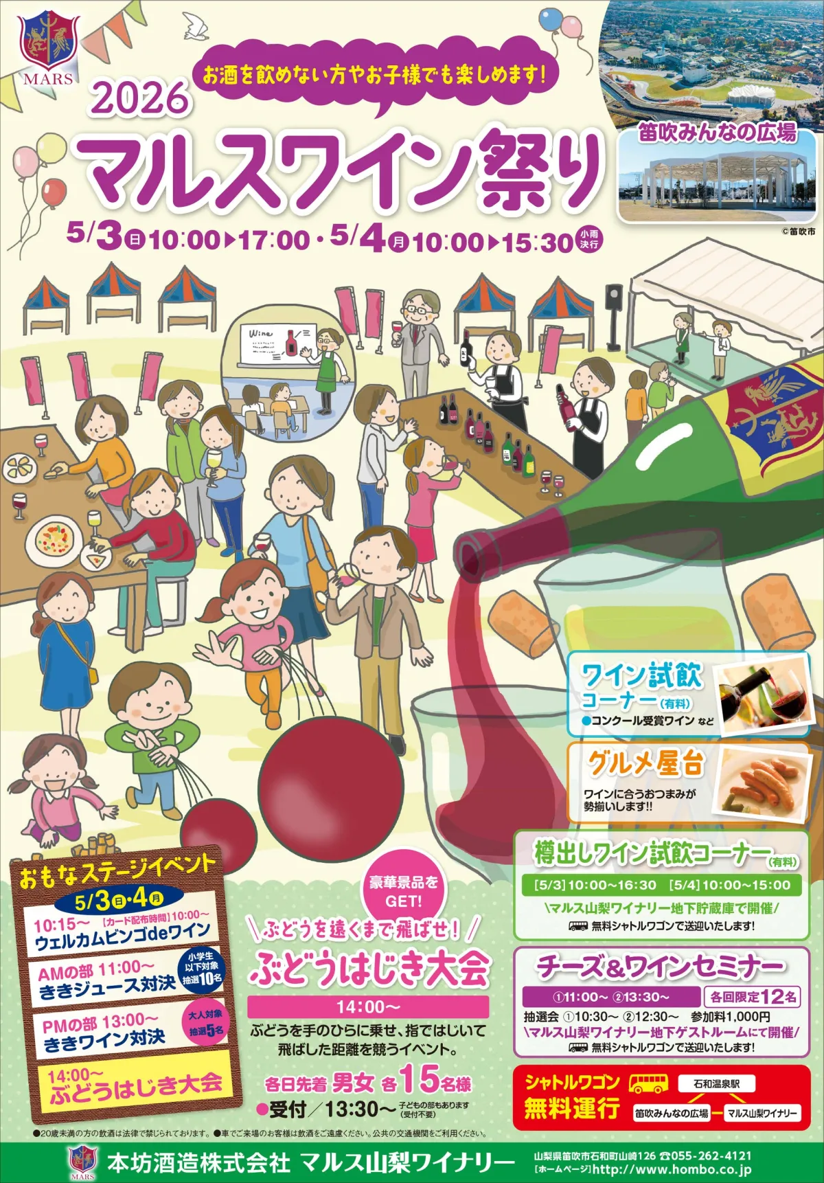2026マルスワイン祭り。本坊酒造株式会社が主催し、日頃のご愛顧に感謝の気持ちを込めて行われるこのイベントは、家族全員が楽しめる内容が盛りだくさんです。