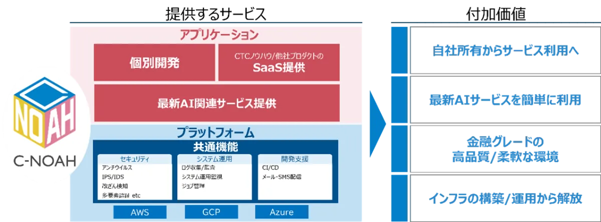 伊藤忠テクノソリューションズ株式会社(以下、CTC)は、金融機関向けの業務アプリケーションとシステム基盤を提供する新サービス「C-NOAH(シー・ノア)」を開始しました。このサービスは、金融業界のニーズに特化した業務向けアプリケーションに加えて、安心・安全なシステム基盤をSaaS形式で提供します。
