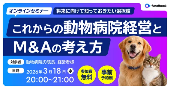 株式会社チェンジホールディングスの子会社である株式会社fundbookは、株式会社アスコと共に動物病院の院長や経営者向けの無料オンラインセミナー「これからの動物病院経営とM&Aの考え方」を2026年3月18日に開催します。後継者問題や人材不足が顕著な動物病院業界において、M&Aや事業承継に関する知識を深める絶好の機会です。
