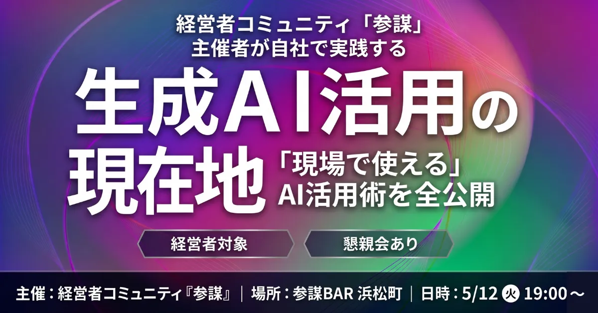 2026年5月12日(火)、経営者コミュニティ「参謀」を運営する株式会社経営参謀が、AIの実践的な活用法を学ぶ勉強会を東京・浜松町にある参謀BARで開催します。これは、新谷健司氏が主宰する「生成AI実践会」の知見をもとに、参加者が実際に業務に取り入れられる具体的なAI活用術を紹介する貴重な機会です。