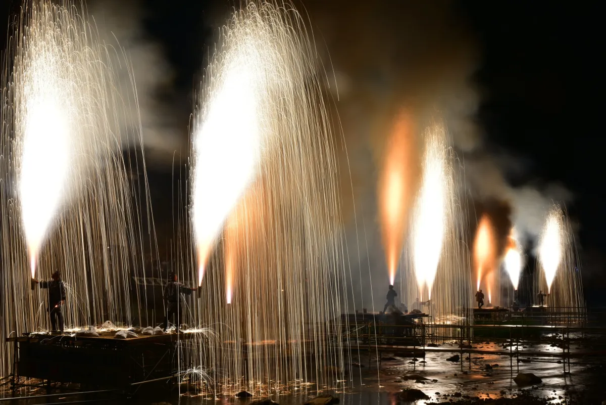 火柱は8メートルから10メートルに達し、打上げの後には轟音が響き渡るため、圧倒的な迫力を体感できます。打ち上げられる本数は約180本で、約90分間にわたって行われ、その美しさと迫力は見る者を魅了します。