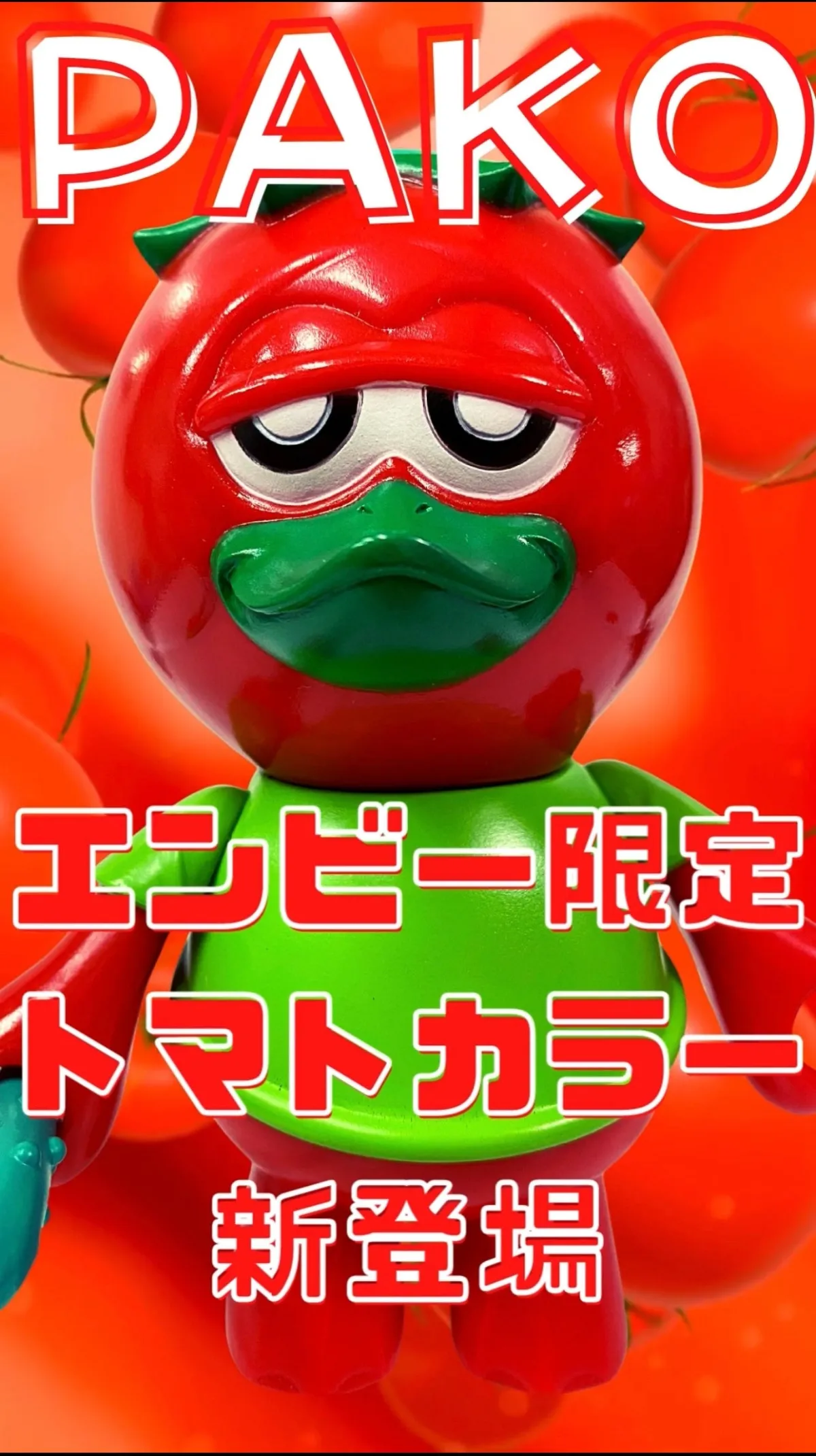 新商品「パコトマトカラー」は、カッパをモチーフにしたフィギュア「パコ」がトマトとして生まれ変わったものです。ソフビフィギュアは、遊び心満載のギミックを搭載しており、どこか愛らしく、見る者すべてに元気を与えるデザインになっています。エンビーによる特注成型色「エンビーレッド」が使用されており、ブリリアントな色合いと共に瑞々しさを感じさせる仕上がりです。