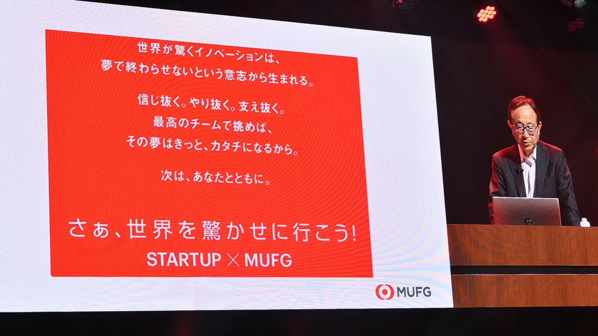 まず、「Contribution」において、MUFGの決意を表現するタグライン「さぁ、世界を驚かせに行こう!」が発表されました。このフレーズには、イノベーションの支援がMUFG一社だけでは達成できないこと、また、スタートアップとその周囲のすべてのステークホルダーの協力が不可欠であるという強いメッセージが込められています。このタグラインは、スタートアップによる日本発のイノベーションを促進する姿勢を象徴しています。