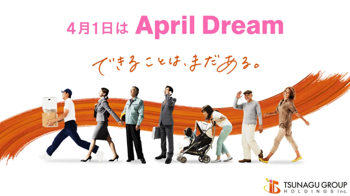 4月1日、ツナググループはApril Dreamに賛同し、未来のビジョンを発信しました。2030年の労働需給ギャップを埋めるための道のりは険しいですが、私たちは「働く」という行為がもたらす力を信じ、その一歩を歩み続けます。すべての人が活躍できる社会を創るため、私たちが何をし、どのように世界を変えていけるか、これからも発信していきます。