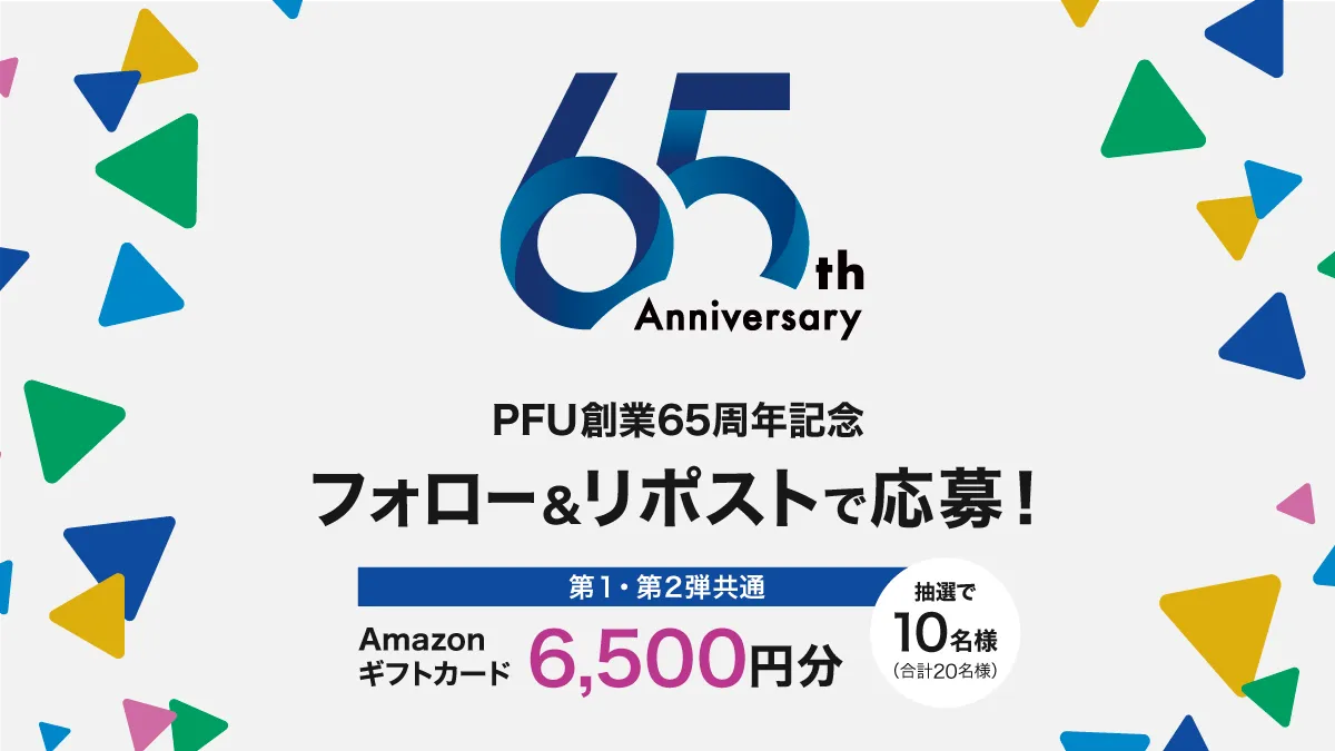 さらに、PFUは公式X(Twitter)を活用した「PFU創業65周年記念フォロー&リポストキャンペーン」を10月8日から開催します。このキャンペーンでは、抽選で20名にAmazonギフトカード6,500円分をプレゼント!参加方法は簡単で、PFUの公式アカウント(@PFU_JP)をフォローし、指定の投稿をリポストするだけで応募可能です。また、「#PFU創業65周年キャンペーン」と祝いのメッセージを添えることで、当選確率もアップします。