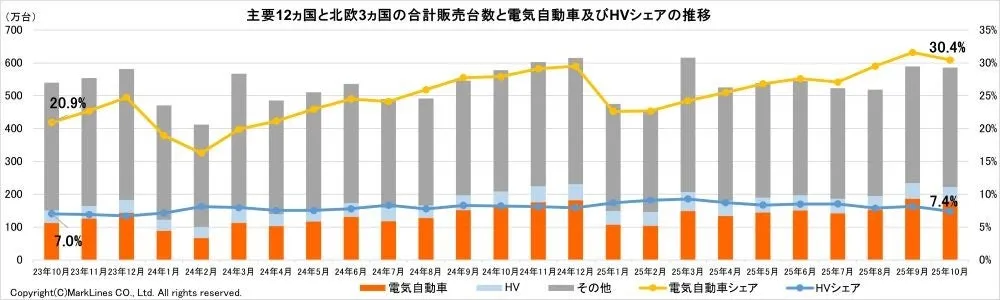 2025年10月、これらの国での電気自動車の販売台数は合計178.3万台となりました。これは前月比で4.3%の減少ですが、前年同月比では10.5%の増加を示しています。また、10月の電気自動車の市場シェアは30.4%で、前年同月に比べて2.5ポイントの増加が見られました。