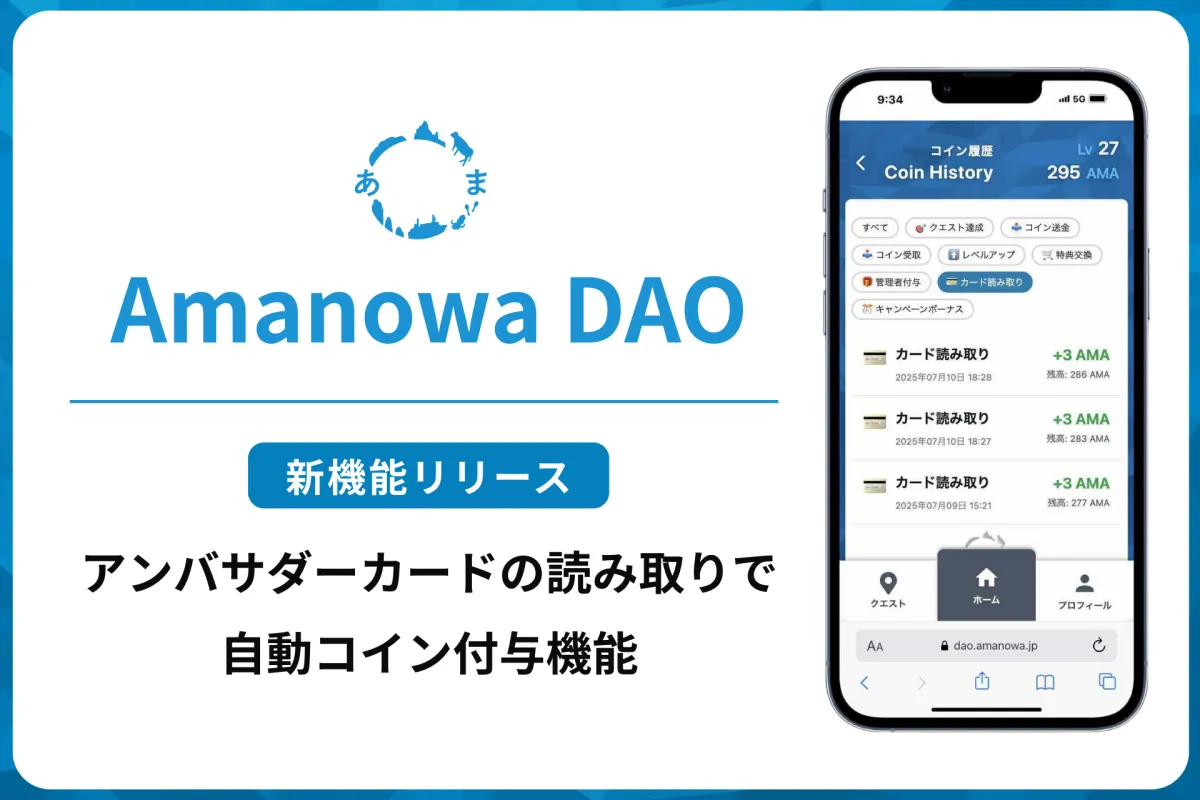 この新機能により、海士町のオフィシャルアンバサダーたちは、出会った人々にアンバサダーカードを提供することで、海士町の魅力を広めると同時に、Amanowa DAOアプリ内で「AMAコイン」を自動的に受け取ることができます。これにより、地域貢献活動がリアルタイムで可視化され、関係人口の活動を促進することが狙いです。