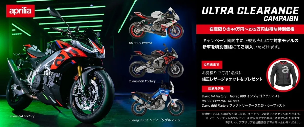 ピアッジオグループジャパン株式会社が実施する『ULTRA CLEARANCE CAMPAIGN』が2025年10月4日から始まります。このキャンペーンは、アプリリアのスポーツモデルを特別価格で提供し、さらに魅力的なプレゼントも用意しています。