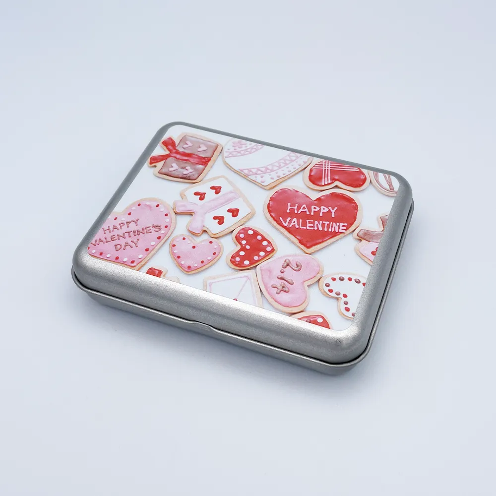 なお、このブリキ缶はお菓子や小物を収納するためにも最適。イベントや記念品としても非常に重宝されるため、企業でのノベルティやビジュアルを印刷したオリジナルグッズの制作にも向いています。シンプルながら存在感のあるスクエア型は、さまざまなシーンで活用できること間違いありません。