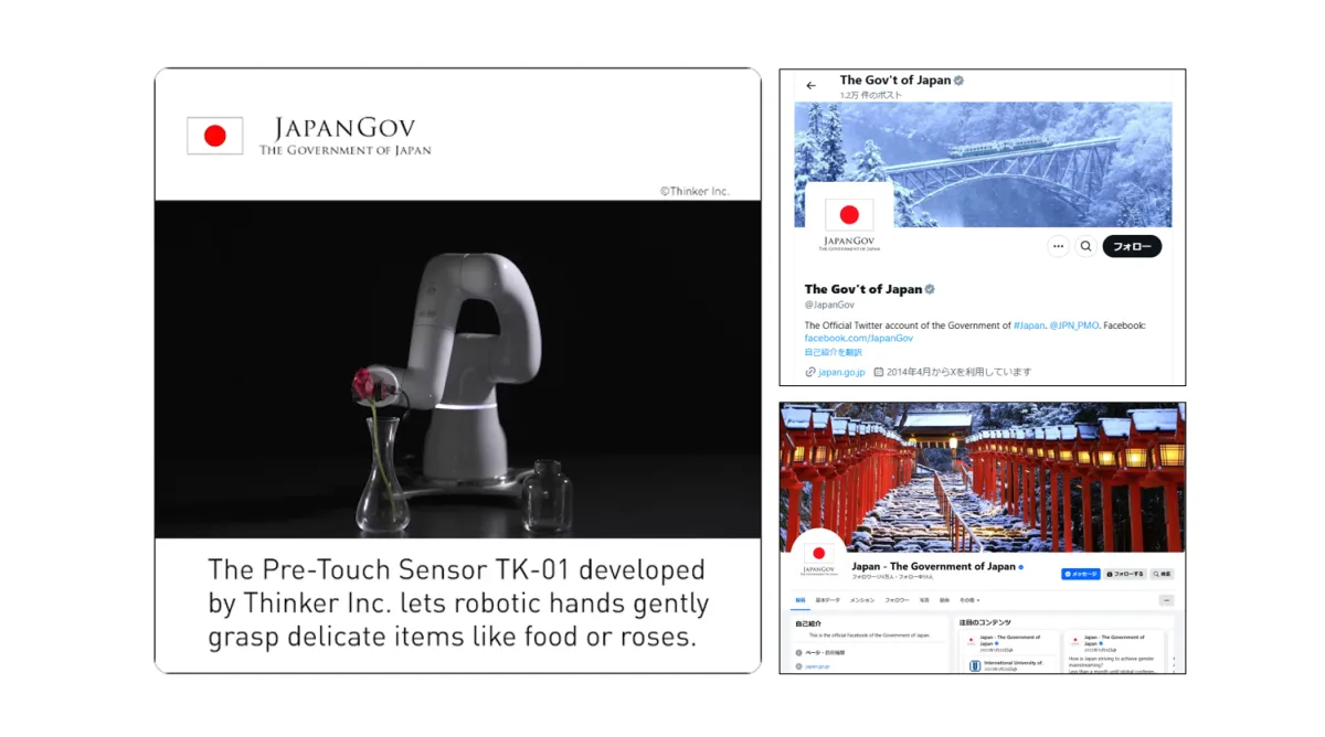 日本のイノベーションを世界に発信する「JAPAN Gov」は、Facebookで376万人以上、X(旧Twitter)で48.6万人、LinkedInで22.7万人のフォロワーを持ち、その影響力は抜群です。こうした舞台で「Thinker Model A」の技術が評価されたことは、ロボット業界にとって大きなニュースと言えるでしょう。