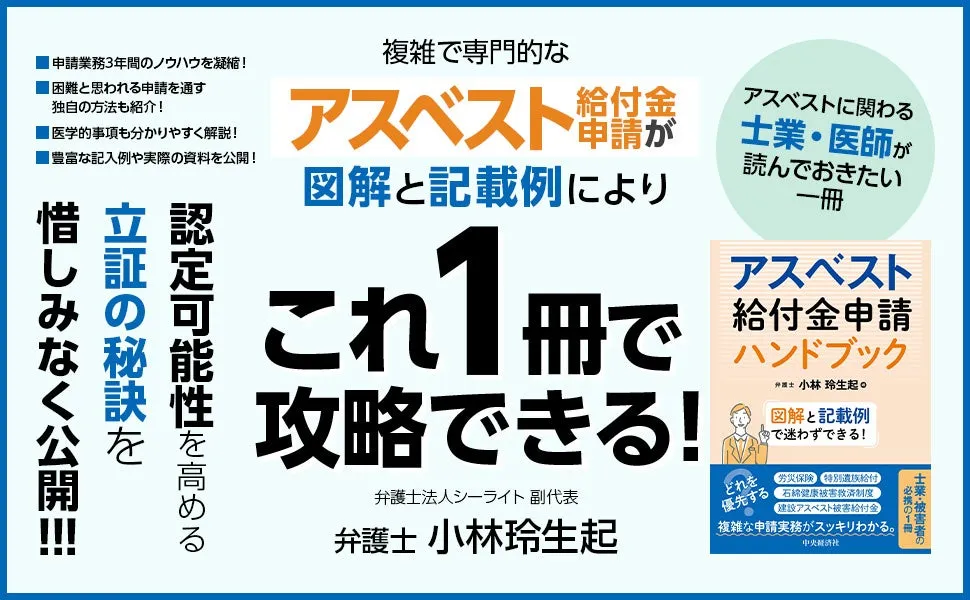 2025年4月22日、新たに刊行された書籍『アスベスト給付金申請ハンドブック―図解と記載例で迷わずできる!』は、アスベスト被害者を支援するための貴重な資料です。この書籍は、弁護士法人シーライトの副代表である小林玲生起が執筆し、アスベスト給付金制度の複雑さを解明した内容となっています。具体的な記載例や図表が多く使われており、誰でも理解しやすいように工夫されています。