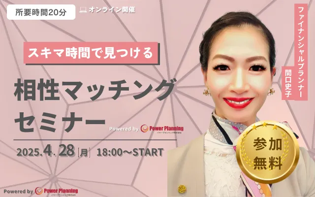 4月28日(月)18時、無料マネーセミナー「相性マッチングセミナー」がオンラインで実施されます。このセミナーは、「アットセミナー」を運営するパワープランニング株式会社によるもので、スキマ時間を有効活用して自分に合ったファイナンシャルプランナー(FP)を見つけることを目的としています。