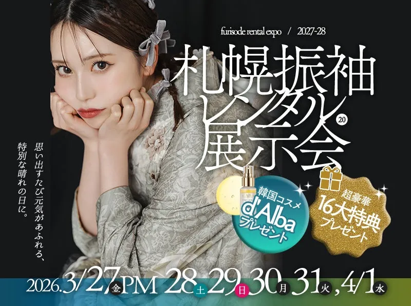 北海道札幌市にて、振袖レンタルの展示会が2026年3月27日から4月1日まで開催されます。この展示会は、成人式参加予定者に向けて特別に設けられたもので、場所は特にアクセスの良い「サッポロファクトリー店」と「札幌中央店」の2会場です。部屋ごとに異なるデザインの振袖が取り揃えられており、試着も可能。新作の振袖も幅広く取り扱っています。