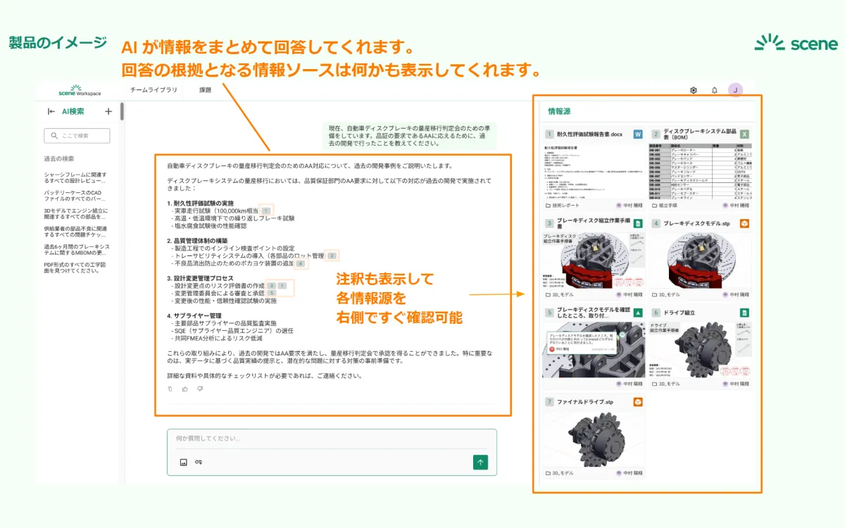 Scene AIは、関連するファイルのみを提示するのではなく、複数の情報ソースを横断して探し、必要なポイントを抽出して回答を生成します。生成された回答には注釈として情報源が提示されるため、根拠が確認可能です。3Dデータも含め、あらゆる情報にアクセスできます。
