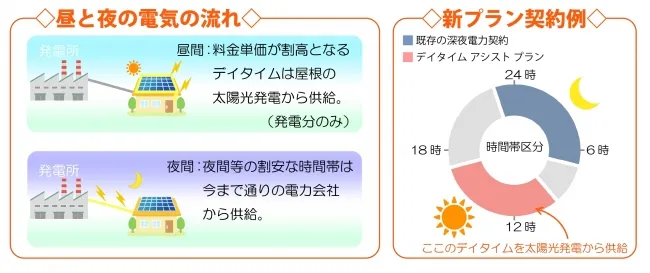 「デイタイムアシストプラン」は、契約中の電力会社からの電気を利用しつつ、日中の割高な電気代を抑えるために、太陽光発電システムを無料で設置する内容です。夜間に安価な電気を利用しつつ、日中は自宅の屋根で発電した電気を割安で利用できるというメリットがあります。このように、自己発電を通じてコスト削減が可能となります。