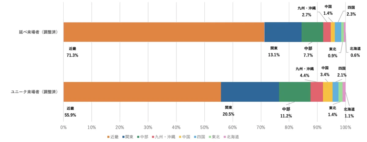 万博の来場者データを用いた調査では、延べ来場者の約70%以上が近畿圏からの参加者であることが確認されつつも、ユニーク来場者については、関東圏や中部圏からも多くの参加者があったことが示されています。特に、万博に訪れることで周辺地域への観光が活発化していることが見て取れます。