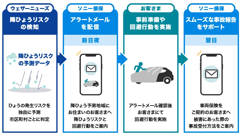 降雹アラートサービスでは、ウェザーニューズ社からの気象データ提供サービス「WxTech(R)」を使用し、降ひょうが予測される地域の自動車保険契約者に前夜にアラートメールを配信します。このアラートメールには、降雹のリスクに加え、具体的な被害回避策が記載されます。また、車両保険に契約しているお客様には、被害が発生した際にスムーズに保険金を請求できるよう、ウェブサイトやLINEでの事故受付案内を翌日にお届けします。