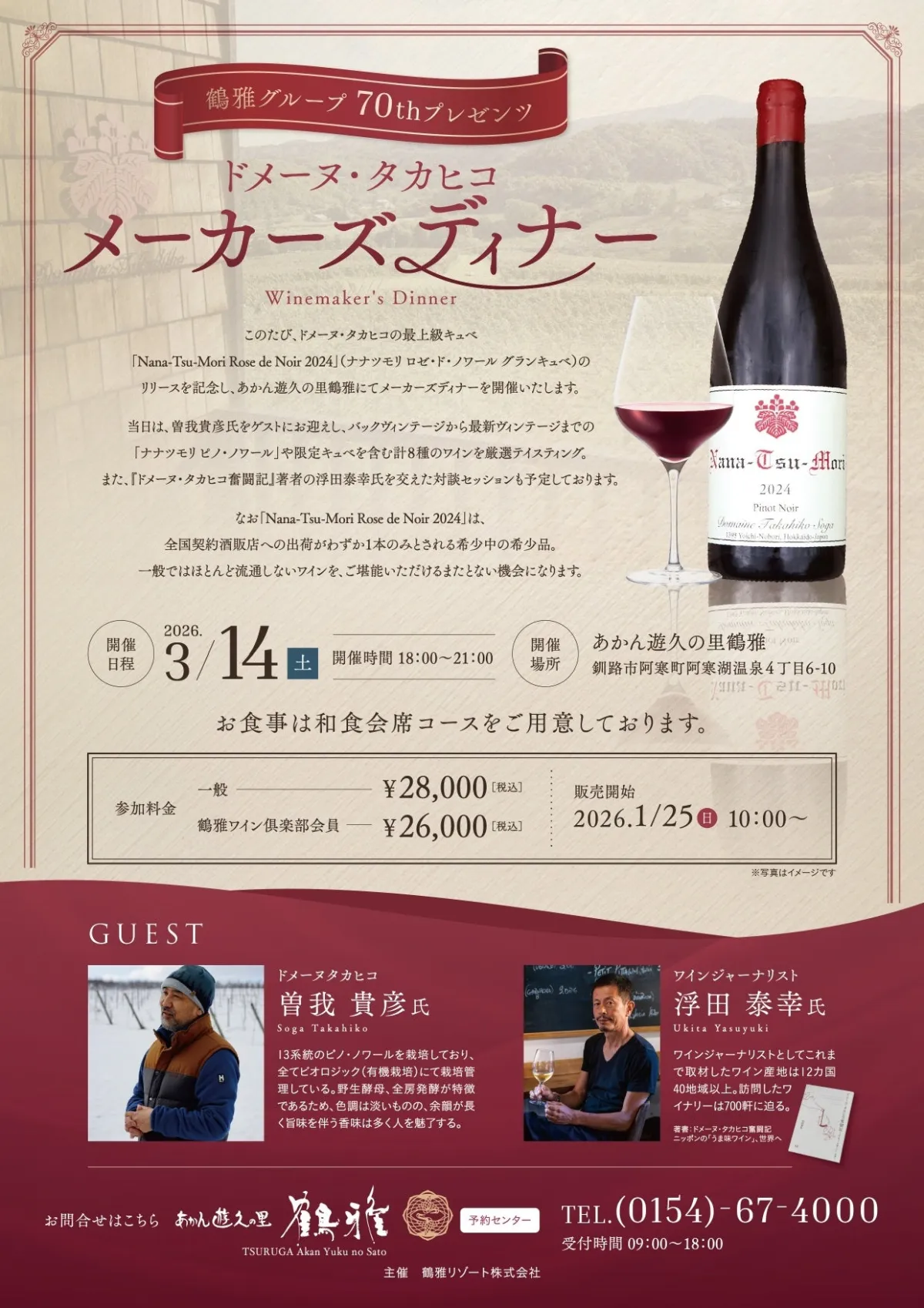 北海道釧路市に位置するあかん遊久の里 鶴雅において、特別なワインイベントが開催されます。3月14日土曜日には、ドメーヌ・タカヒコが誇る最高峰のワイン「ナナツモリ ロゼ・ド・ノワール 2024」のリリースを祝う「メーカーズディナー」が行われます。このワインは全国の酒販店に1本しか出荷されないという極めて希少なものであり、ここでしか味わえない貴重な体験です。