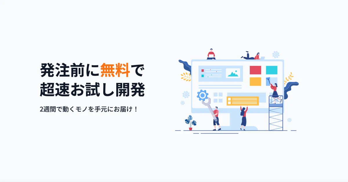 「申し込み→ヒアリング→プロトタイプ公開→商談」と移行し、最短でも2営業日内にプロトタイプのURLが提供されます。加えて、プロトタイプの提供は完全に無料であり、気に入らなければここで終了することが可能です。その場合、発生する費用は一切ありません。もし本開発に進む場合は、作成したプロトタイプを基に見積もりが行われるため、「言葉だけでは伝わらない」というリスクを大幅に削減できます。