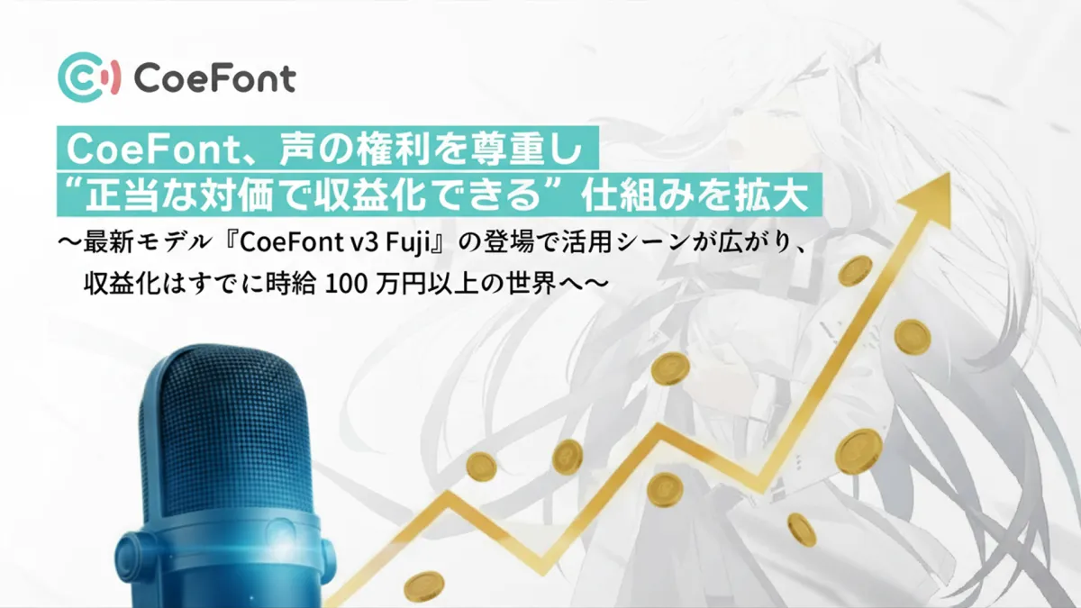 株式会社CoeFont(東京都港区)が推進しているAI音声プラットフォーム「CoeFont」では、声の提供者が安心して収益を得られる仕組みの拡大に力を入れています。特に、最近登場した最新音声モデル「CoeFont v3 Fuji」は、その性能向上により声の活用シーンを広げ、収益機会が急増しています。実際のところ、登録者の中には100万円以上の収益を上げる人も多く、月額数万円規模を継続的に得ているケースも報告されています。これは一般的な副業の収入に匹敵するものであり、声を用いた新たな働き方の可能性を示しています。